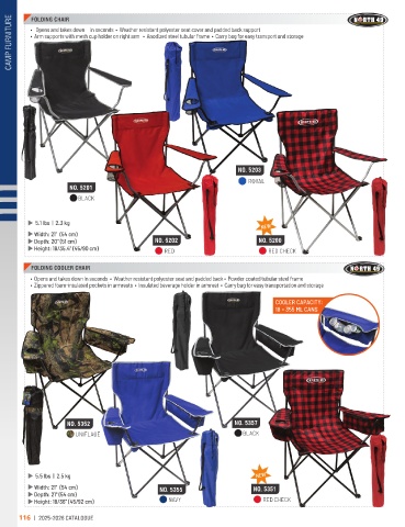CAMP FURNITURE • Opens and takes down in seconds • Weather resistant polyester seat cover and padded back support
