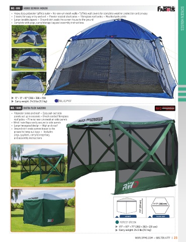 • Large durable zippers • Ground skirt seals the screen house to the ground SCREEN HOUSES