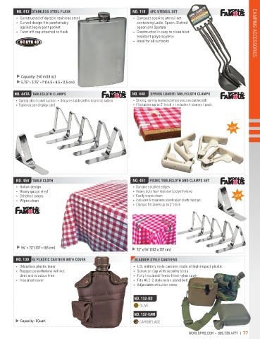 • Twist off cap attached to flask • Constructed in easy to clean heat CAMPING ACCESSORIES